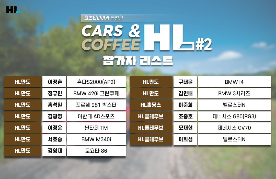 지난해 진행되었던 왓츠인마이카의 특별편, <CARS & COFFEE HL>을 기억하시나요? 주말 이른 시간임에도 자동차에 누구보다 진심인 HL 임직원들이 모여 서로의 차량을 구경하고 정보를 공유하는 등 즐거운 시간을 보냈습니다.