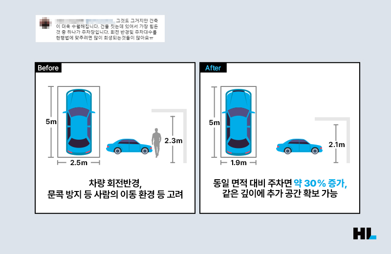 동선: 파키를 도입함으로써 주차장을 새롭게 구성할 수 있다고 보면 될 것 같아요. 기본적으로 주차장에서 사람의 이동에 필요한 공간을 없애 더 넓은 면적을 확보할 수 있고, 사람이 직접 주차할 땐 회전반경 등의 문제로 이용할 수 없는 공간까지 파키를 통해 활용할 수 있어요. 이렇게 확보한 추가 공간들로 주차장을 재배치하면 약 30%의 추가 주차면을 확보할 수 있습니다. 그리고 차체의 높이만큼만 공간을 확보하면 되기 때문에 지금의 주차장 규정보다 낮은 기계식 주차장 높이를 적용할 수 있어서 같은 높이에 더 많은 공간을 구성할 수 있습니다.