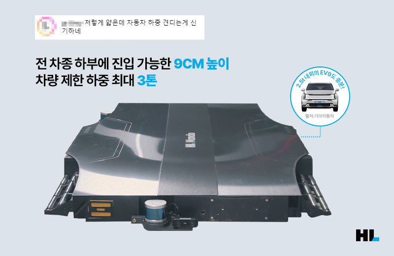 파키는 차체가 낮은 차량 하부에도 진입할 수 있는 9㎝의 얇은 두께와 경차부터 SUV의 무게도 싣고 나를 수 있는 견고함을 동시에 갖추었는데요. 최대 3톤의 하중까지 견딜 수 있어 배터리 등으로 인해 내연기관 차량보다 무거운 전기차도 거뜬히 들고 운반할 수 있습니다.