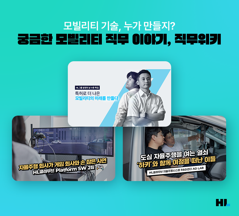 HL Mobility Labs의 인기 요인 중 하나는 ‘생생한 모빌리티 직무 스토리’ 때문입니다. ‘모빌리티 회사 사람들은 어떻게 일할까?’ 자율주행, 주차로봇, SDV 등 모빌리티 직무는 우리에게 생소하고, 정보도 적기 때문에 궁금증만으로 남을 때가 많은데요. HL Mobility Labs에서는 이런 궁금증을 가진 분들을 위해 HL만도와 HL클레무브의 임직원들이 자신의 직무를 소개하는 <직무위키>를 제작하고 있습니다. HW부터 SW까지 자동차 산업의 다양한 분야에 대한 직무 정보와 함께 현직자들의 솔직한 회사생활 이야기를 담은 이야기로 많은 취준생들의 호응을 얻고 있습니다.