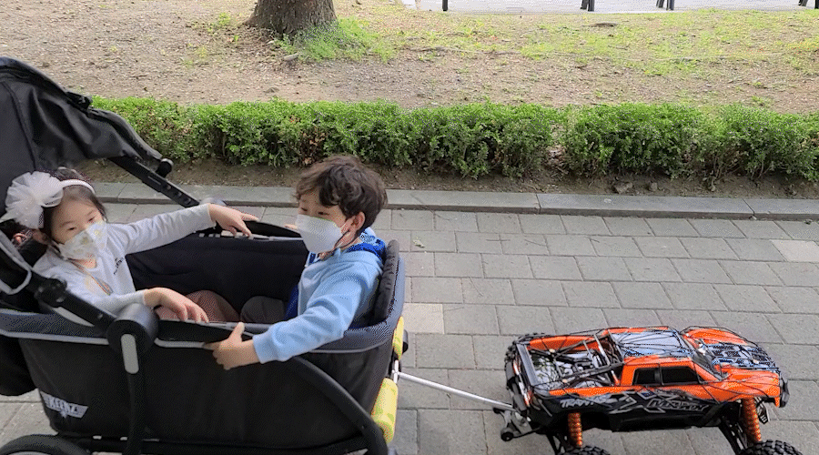RC카를 좋아해요. 예전에는 RC로 등산을 즐기는 트라이얼 장르를 하다가 가족과도 함께 즐기고 싶어서 1:6 RC카 웨건으로 아이들과 함께 하고 있습니다. 특히 여름에 야외에서 아주 유용하게 사용하고 있어요. 짐도 무겁고 날씨도 더울 때는 웨건과 RC카만 있으면 문제 없거든요. 하하. 아이들도 좋아하고요. 사실 RC카도 배터리로 주행하는 건데, 어쩌면 그때 배터리의 장점을 경험해서 지금의 EV9을 산 건지도 모르겠네요.