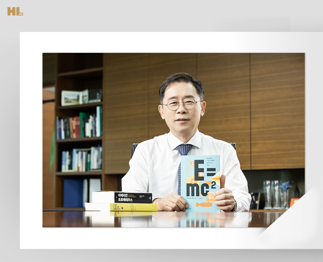 오늘 <CEO의 서재>를 위해 조성현 부회장이 준비한 책은 <CEO의 서재> 최초, 두 권의 책입니다. 바로 ‘E=mc2 (데이비드 보더니스 저)’와 ‘아메리칸 프로메테우스(카이 버드, 마틴 셔윈 저)’인데요. ‘E=mc2’는 ‘세상에서 가장 유명한 방정식의 일생’이라는 부제답게 방정식이 세상에 태어나기까지의 과정을 알기 쉽게 설명한 일종의 과학 역사서입니다.