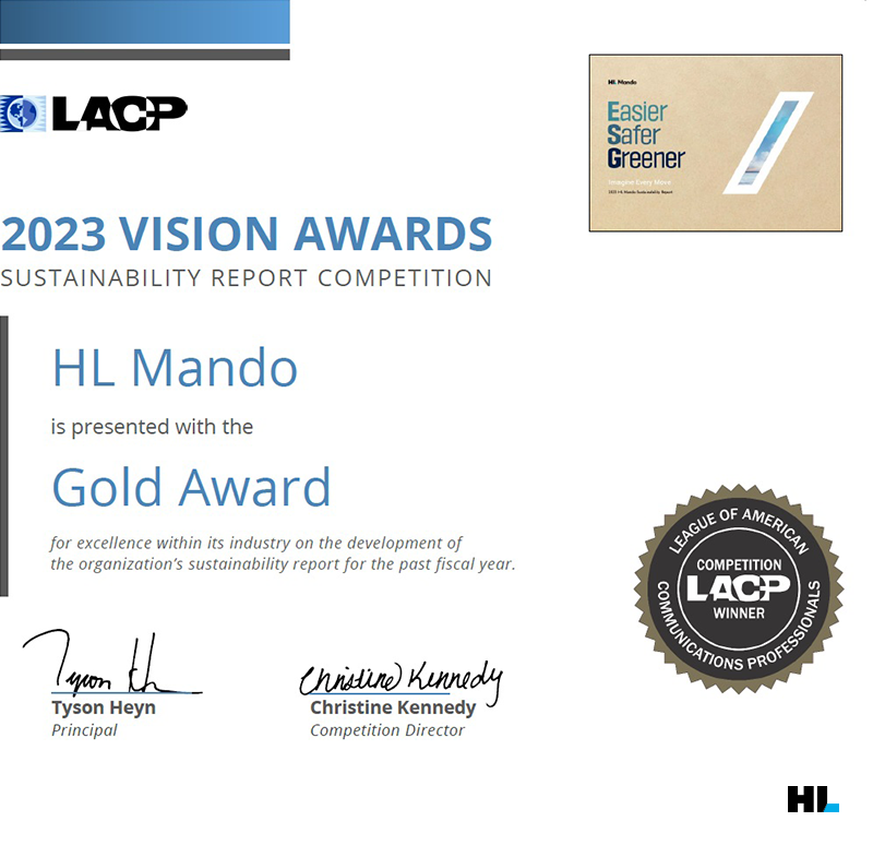 HL그룹 글로벌 SDV 선도기업 HL만도와 HL클레무브가 ‘2023 *LACP 비전 어워즈(Vision Awards)’ 금상(Gold Award)을 받았았습니다. ‘2023 지속가능경영보고서’로 거둔 성과입니다. HL만도는 올해로 3년 연속 ‘LACP 비전 어워즈’ 수상의 쾌거를 이뤘는데요.