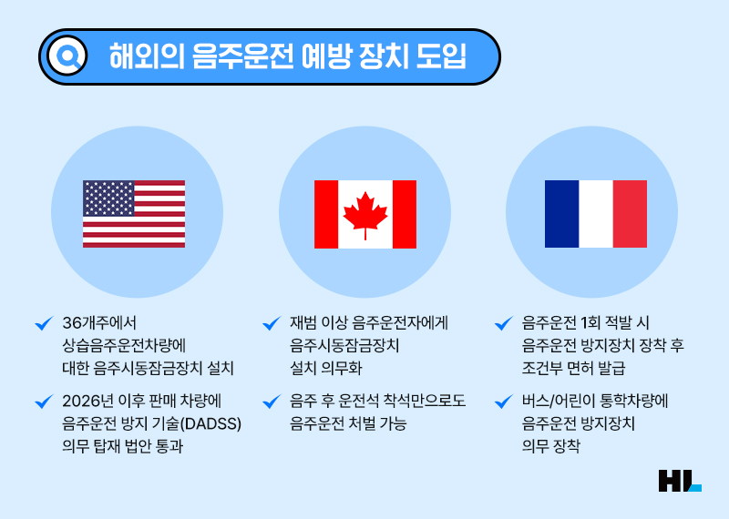 미국의 경우 다수의 주에서 상습 음주운전차량에 음주시동잠금장치를 설치하도록 하고 있으며, 지난 2021년에는 2026년부터 판매되는 모든 차량에 음주운전 방지 기술(DADSS, The Driver Alcohol Detection System for Safety)을 의무 탑재하도록 하는 법안이 통과되었습니다. 이 밖에도 호주, 스웨덴 등 다양한 국가에서 음주운전 방지장치를 도입하고 있습니다.