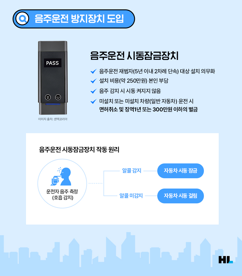 잊을 만하면 뉴스에서 접하게 되는 음주운전 사고 소식에 음주운전 단속과 처벌 강화에 대한 목소리가 높아지고 있습니다. 이에 오는 25일부터 상습 음주운전자에 대해 음주운전을 물리적으로 제한하는 제도가 시행될 예정인데요. 오늘은 음주운전을 예방하기 위한 기술에 대해 알아봅니다.