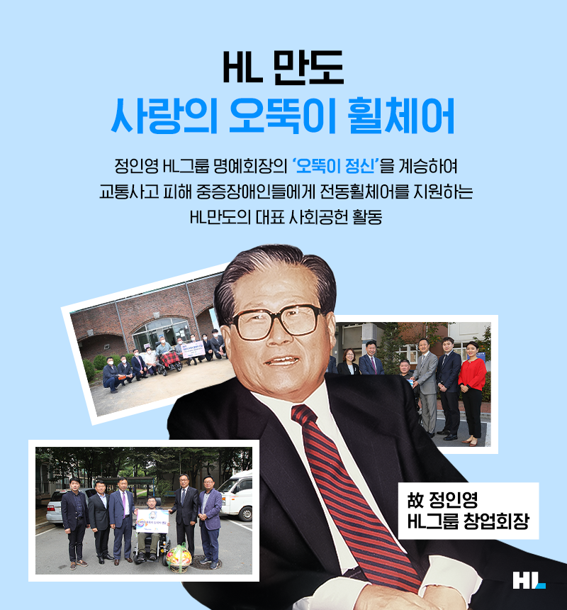HL만도의 ‘사랑의 오뚝이 휠체어’는 병석에서 일어나 휠체어를 타고 전 세계를 누비셨던 故정인영 HL그룹 창업회장님의 ‘오뚝이 정신’을 계승하여 시작된 사업으로, 올해로 13년째 이어오고 있습니다. 교통사고피해를 입은 중증장애인을 대상으로 수동·전동휠체어, 전동휠체어 배터리, 전동카트를 지원합니다.