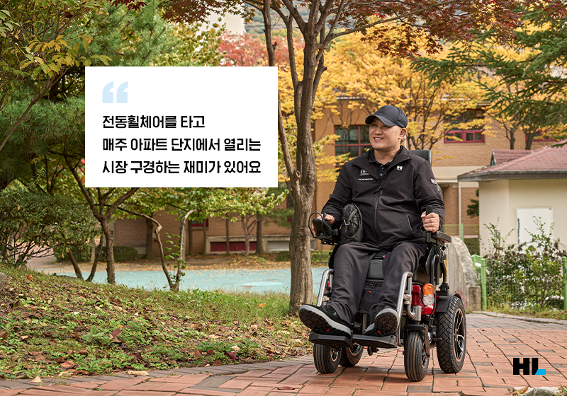 정영: 차를 타고 가기에 애매한 곳들을 전동휠체어로 다니고 있어요. 차로 이동하면 차에 휠체어를 싣고 내리고 하는 과정이 번거롭고 힘들거든요. 이런 부분들을 해소할 수 있는 게 전동 휠체어인 거죠. 애매한 거리를 빠르게 오갈 수 있고 오르막이나 턱도 쉽게 넘을 수 있어서 편하게 다닐 수 있어요.