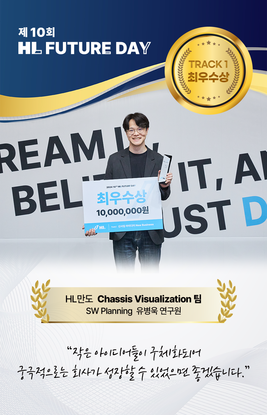 “현재 자동차업계에서는 하드웨어에서 소프트웨어로의 전환이 추세인데요, 이러한 트렌드에 한 발 빠르게 대응해 나가는 모습을 보여드리고 싶습니다. 보다 적극적으로 회사의 미래 먹거리를 발굴하고 체질을 개선하는 데에 기여하고 싶고요, Future Day의 취지처럼 작은 아이디어들이 구체화되고 현실적인 사업들로 연결되어 궁극적으로는 회사가 성장할 수 있었으면 좋겠습니다”