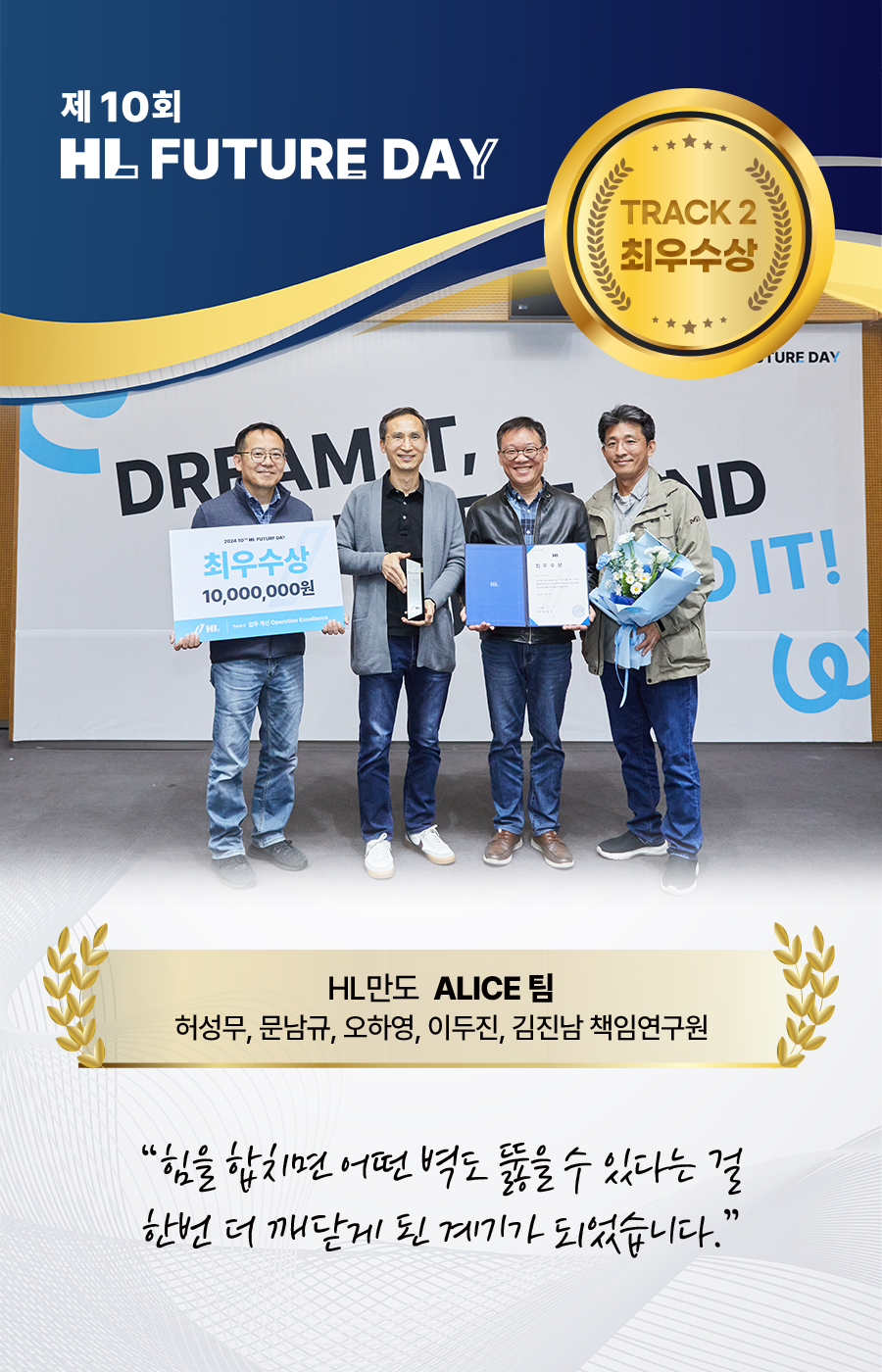 치열한 경합 끝에 트랙별로 최우수상 1팀, 우수상 1팀, 장려상 2팀이 발표될 때마다 뜨거운 환호와 박수가 쏟아졌습니다. 이후 가수 알리의 축하 공연과 참석자들의 행운권 추첨 등 다양한 볼거리와 기념 사진을 끝으로 모두 마무리되었는데요. HL인들의 혁신에 대한 의지가 그 어느 때보다도 빛을 발하는 하루였습니다.