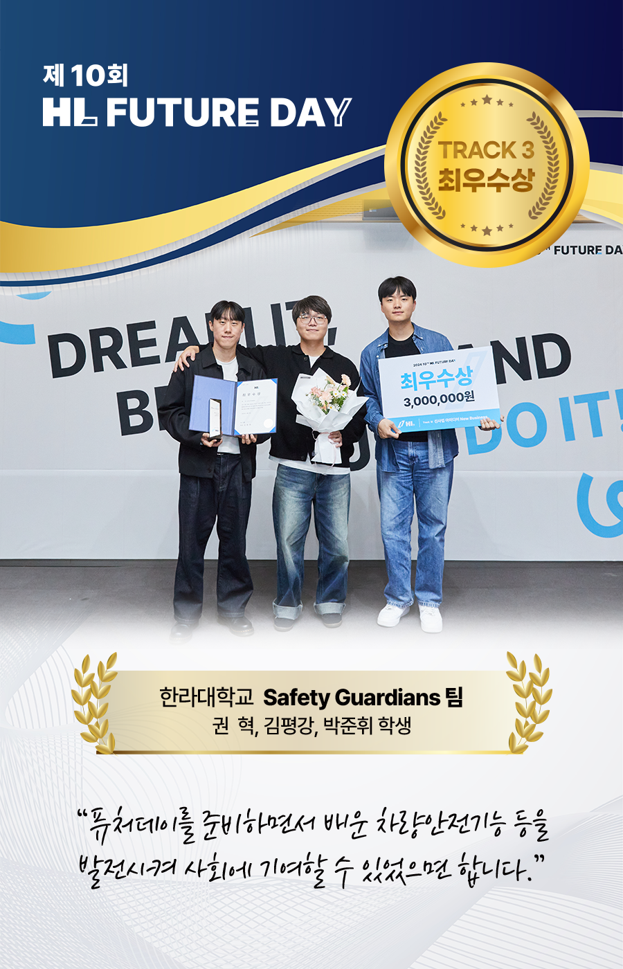 “저희는 한라대학교에서 만도소프트웨어를 전공하고 있는데요, 최근 들어 더욱 빈번하게 발생하고 있는 ‘음주운전’이라는 사회적 이슈에 관심을 가지게 되었고 이 문제를 해결하고자 머리를 맞대게 되었습니다. 이번 프로젝트를 준비하며 법조계와 경찰청 등에 전화도 하고 메일도 보내면서 시행착오에 부딪히기도 했지만, 함께 고생해준 친구들이 있어 잘 헤쳐 나간 것 같아요. 이 자리를 빌려 고맙다는 말을 전하고 싶습니다”