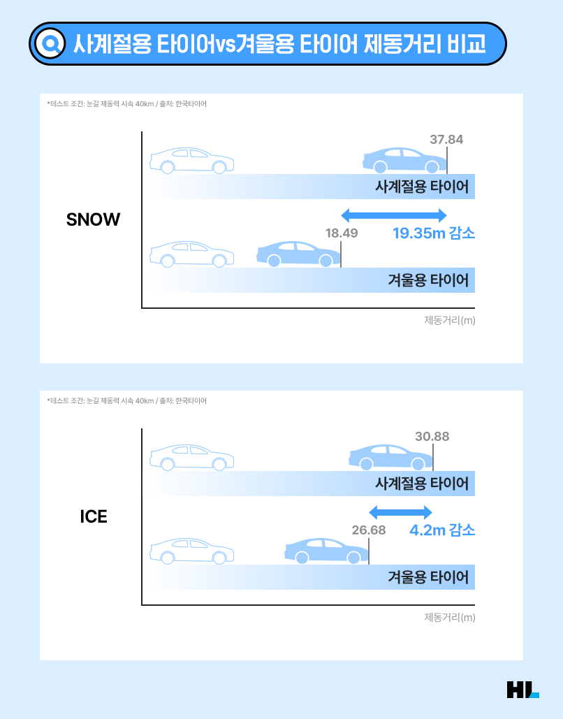 한국타이어에서 진행한 사계절용 타이어와 겨울용 타이어의 제동거리 테스트 결과에 따르면, 겨울용 타이어를 장착했을 때 제동거리가 영하 5도의 눈길에서 19.35m, 빙판길에서는 4.2m 감소했다고 합니다. 눈이 많이 내리는 지역이라면 겨울용 타이어를 사용하는 것이 효과적인 안전 대비책이 될 수 있음을 알 수 있습니다.
