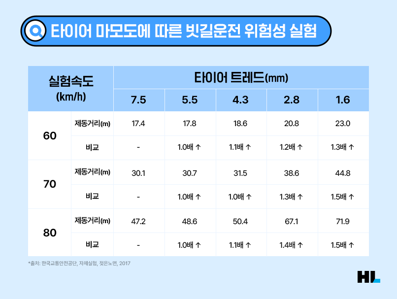 타이어 공기압을 체크했다면, 이제는 타이어의 마모도를 점검할 차례! 타이어가 마모한계선(△표시)까지 닳았을 경우에는 제동력과 핸들 조작 약화, 타이어 파손 등 안전사고의 위험이 높아집니다. 한국교통안전공단이 2017년에 진행했던 빗길운전 실험에서는 타이어 마모도가 높을수록 제동거리가 1.5배까지 증가한 것으로 나타났습니다. 이러한 이유로 자동차관리법에서는 승용차나 SUV의 타이어의 마모 한계를 1.6㎜로 규정하고 있으며, 마모한계를 넘어선 타이어가 장착된 차량에 대해 과태료까지 부과하고 있는 것입니다.