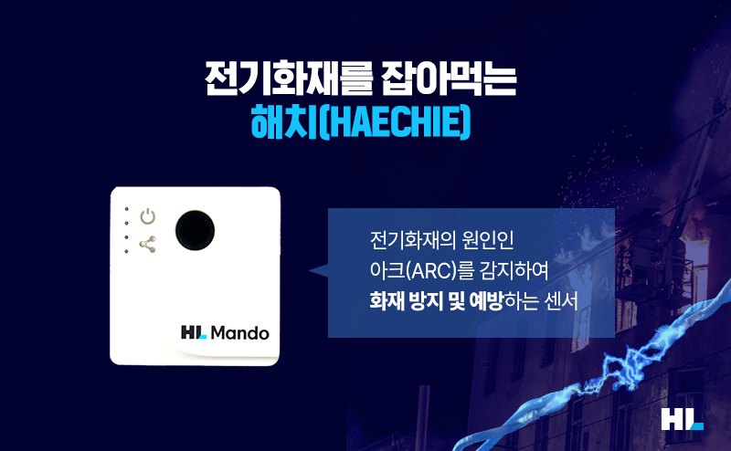 가장 먼저 HL만도가 선보인 ‘해치(HAECHIE)’는 전기화재를 예방하기 위한 센서입니다. 기존의 화재감지기가 화재로 인한 열과 연기를 감지한다면, 해치는 화재의 전조증상을 감지해 화재 발생 자체를 예방하는데요. 전기화재의 주요 원인인 아크(Arc)의 발생을 실시간으로 감지함으로써 아크 발생 시에는 관제실에 알림을 전달해 대형 화재를 미연에 방지할 수 있습니다.