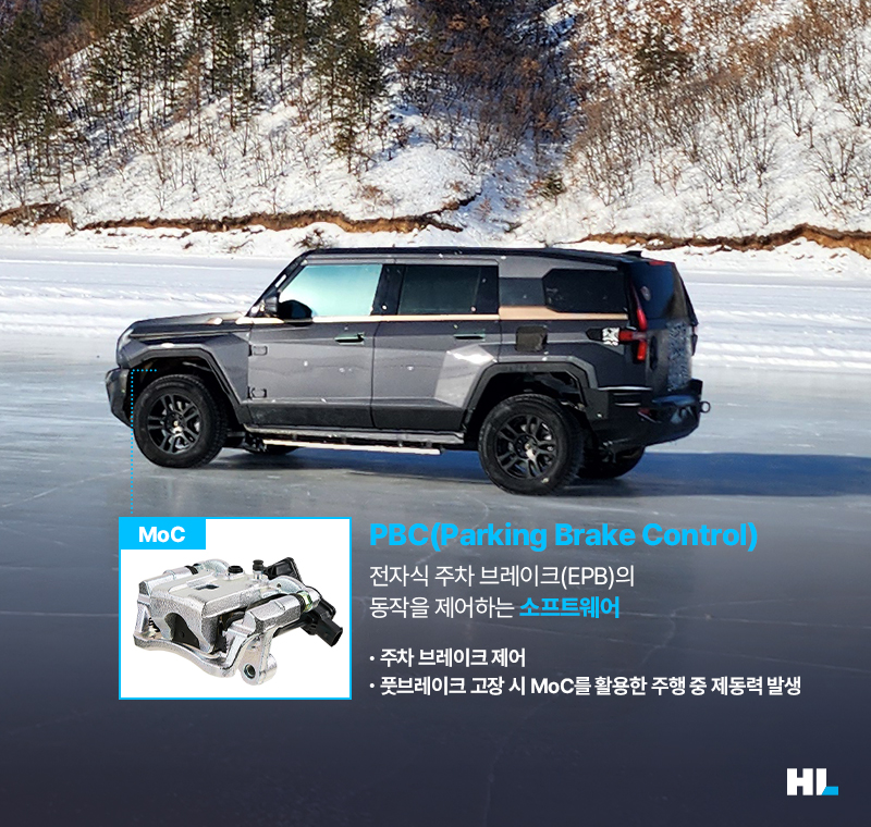 성민: PBC(Parking Brake Control)는 전자식 주차 브레이크(EPB)의 동작을 제어하는 소프트웨어입니다. 최근에는 케이블 없이 MoC(Motor on Caliper) 방식을 적용해 전자식으로 주차 브레이크를 체결하거나 해제하는 데 보조 역할을 수행하고 있죠. 또 주행 중에 풋브레이크 고장과 같은 비상상황이 발생하면 차량이 정차할 수 있도록 제동력을 발생시키기도 합니다.