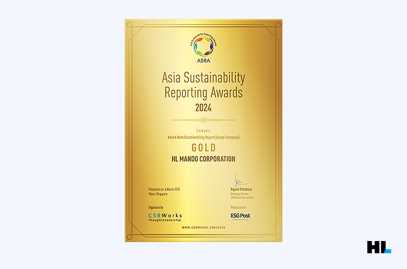 HL만도㈜가 ‘2024 아시아 지속가능보고서 어워즈(ASRA; Asia Sustainability Reporting Awards)’에서 최고 등급 금상(Gold)을 받았습니다. 대기업(Large Company)부문 대한민국 최초 수상입니다. ASRA 금상(Gold)은 본사 거점을 아시아에 마련한 대기업 중 단 한 개 기업에 수여되는 상인데요. 이번 수상이 그 어느 때보다 영예로운 이유입니다. 2019년에 첫 ESG 리포트를 발간한 HL만도는 지난 21년부터 ‘Easier, Safer, Greener’라는 슬로건을 내걸고, *ESRS, *ISSB 등 글로벌 지속가능경영 공시 기준을 선제 적용하고 있습니다.