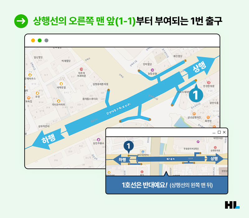 지하철역의 출구 번호는 일정한 규칙에 따라 부여되는데요, 먼저 1번출구가 부여되는 기준은 대부분의 노선에서 상행선의 오른쪽 맨 앞, 그러니까 상행선 1-1 출입구와 가까운 쪽이 1번출구가 됩니다. 1호선의 경우 상행선의 왼쪽 맨 뒤(하행선의 1-1)가 1번출구가 되고, 순환선인 2호선은 외선순환의 우측 맨 앞쪽 출구가 1번이 되는 식이죠. 환승역의 경우에는 빠른 호선을 기준으로 1번출구가 부여됩니다.