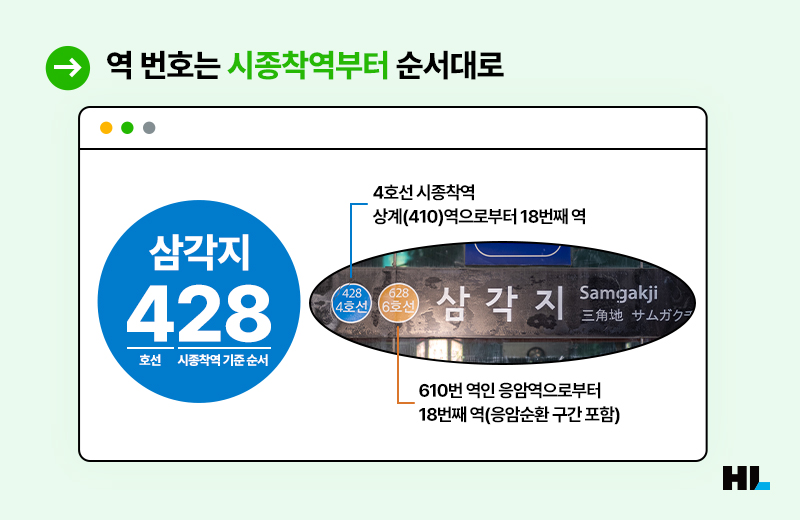 삼각지역을 예로 들어볼까요? 삼각지역은 4호선 428번, 6호선 628번 역인데요. 이는 4호선의 시종착역인 상계역(410)으로부터 18번째, 6호선의 응암역(610)을 기준으로 18번째 역임을 의미합니다