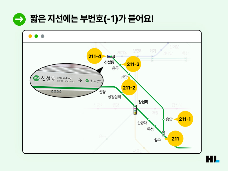 그런데 2호선에는 성수~신설동, 신도림~까치산의 지선도 있는데요. 이 경우에는 각 지선의 출발역으로부터 부번호가 하나씩 붙습니다. 성수지선의 경우 211번인 성수역부터 시작해 211-1(용답)~211-4(신설동)번까지 지선이 운영중이죠.