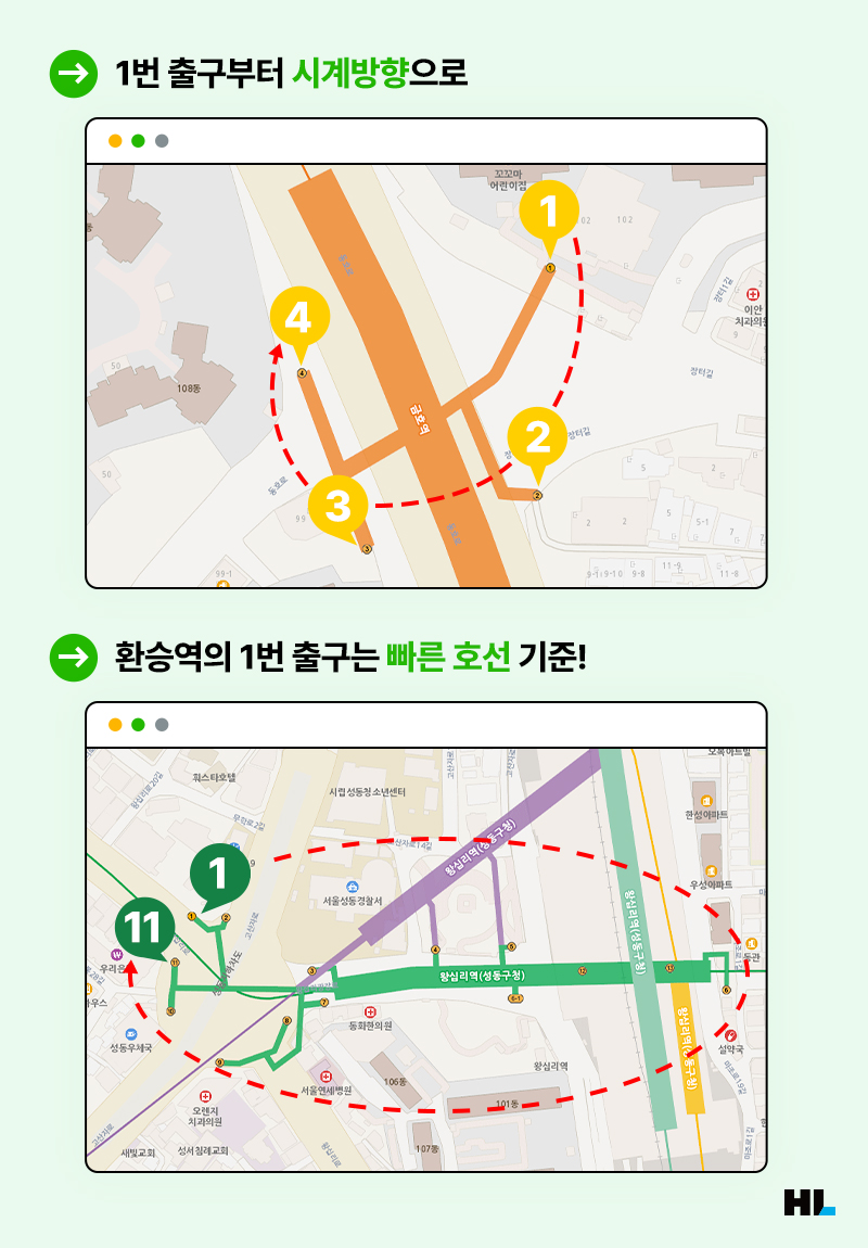 출구번호 기준이 복잡하다고요? 하지만 1번출구만 찾으면 나머지는 쉬워집니다. 바로 모든 출구가 1번출구를 기준으로 시계방향으로 돌며 순서대로 번호가 부여되기 때문이죠. 중간에 새로운 출구가 생기는 경우에는 출구번호를 다시 부여해 시계방향 순서가 유지될 수 있도록 합니다. 다만 출구번호 변경으로 인해 드는 사회적 비용이 클 경우에는 부번호(-1)를 붙이는데요. 왕십리역의 6-1번 출구, 종로3가역의 2-1번 출구, 서울역의 9-1번 출구 등이 바로 그런 경우입니다.