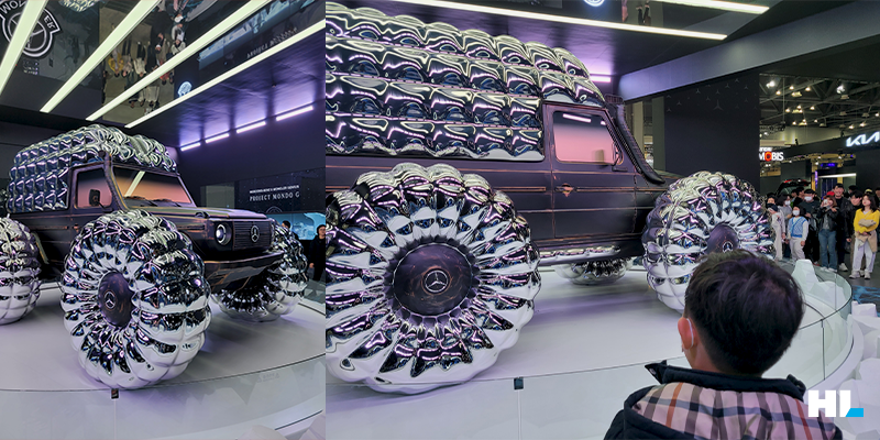 사실 서울모빌리티쇼에서 가장 파격적인 전시를 보여주는 곳은 바로 이곳입니다. 2023년에도 매우 재미있는 전시를 봤던 기억이 있습니다. 아웃도어 브랜드인 몽클레르와 ‘Project Mondo G’라는 컨셉으로 협업 전시를 하였습니다. 제 아이는 저 차를 보며 무슨 생각을 했을까요?