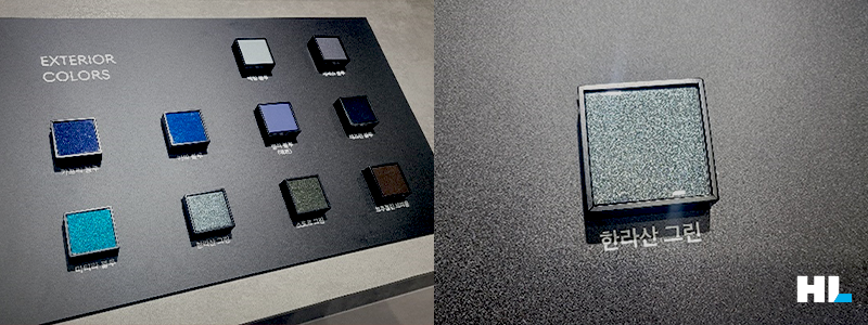 제네시스 전시관 역시 매우 인상적이었습니다. 제네시스라는 브랜드가 지향하는 시장 위치를 고려하여 전시관은 매우 고급스럽게 잘 준비되어 있었습니다. 이번 전시관에서는 특별히 제네시스의 외장 컬러를 직접 보고 비교할 수 있었습니다. 그 중에서 HL인들에게는 왠지 친숙할 수 있는 ‘한라산 그린’이라는 컬러도 있었습니다.