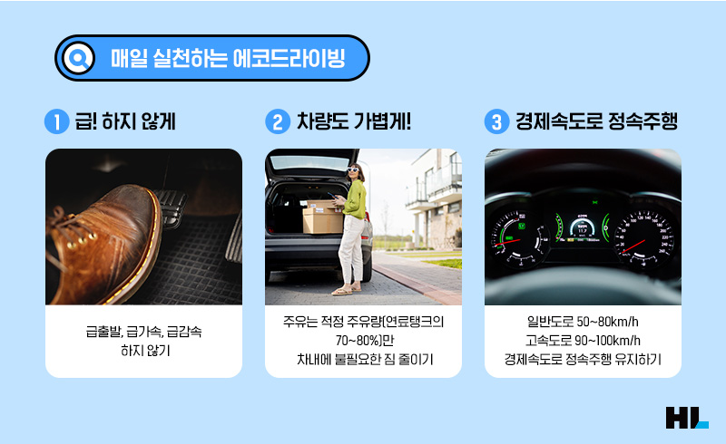 요약하자면 차량을 급하게 움직이지 않고, 경제속도를 유지하며 안전하게 주행하는 것에 핵심이 있는데요. 또한 차량의 무게를 줄이고 적정 공기압을 유지하며 소모품을 주기적으로 점검해 차량의 주행 컨디션을 좋은 상태로 유지해야 합니다. 사람과 다르지 않죠?