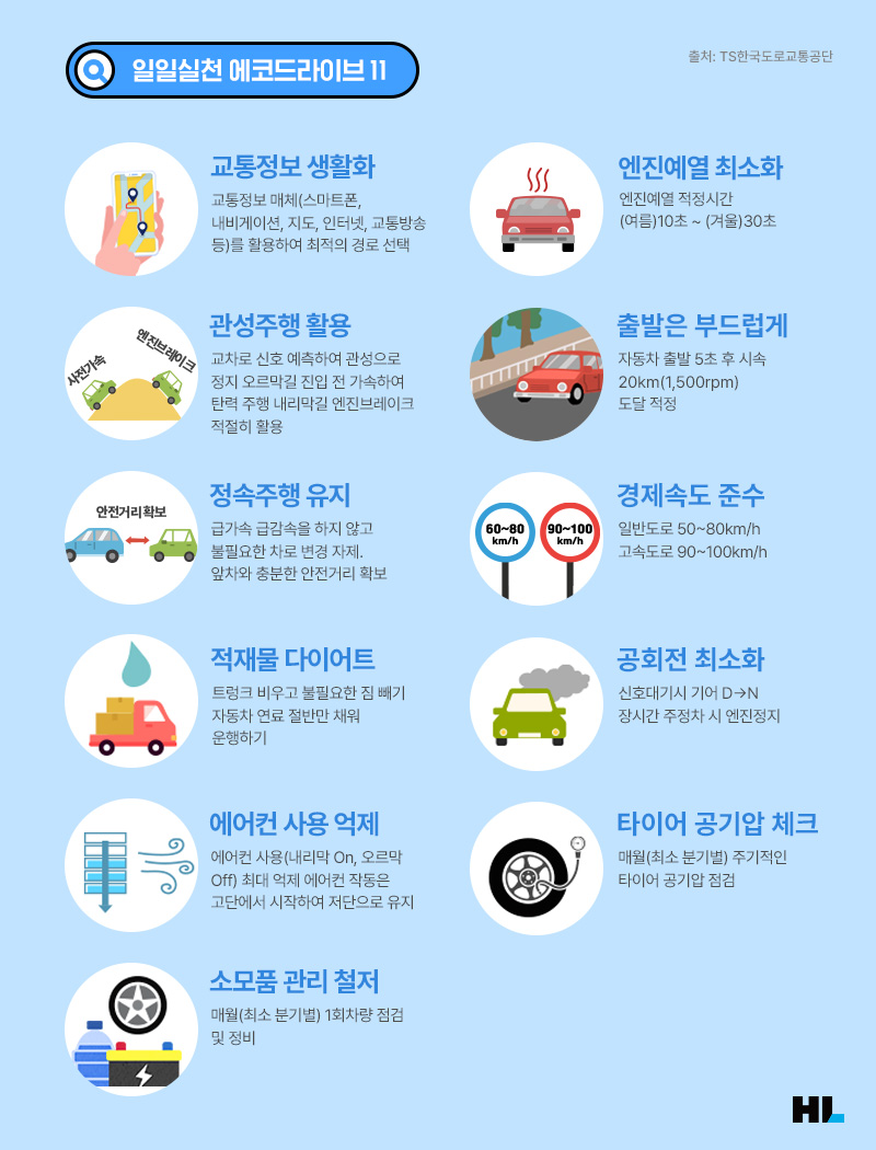 그렇다면 경제운전은 어떻게 실천해야 할까요? TS한국교통안전공단에서는 ‘경제운전 일일(11) 실천’이라는 이름으로 11가지 에코드라이브 실천 수칙을 홍보하고 있는데요.