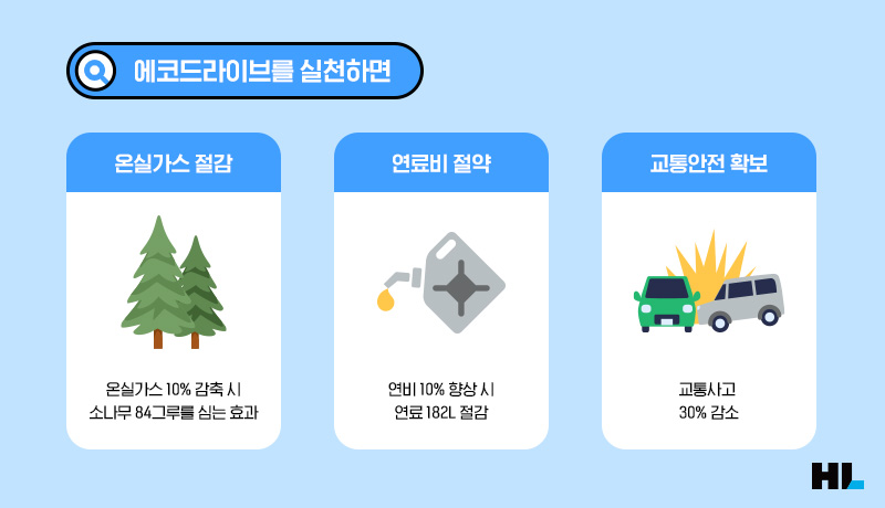 에코드라이브 실천은 경제, 안전, 환경 세 가지 면에서 긍정적인 효과를 가져오는데요. 먼저 우리에게 가장 크게 와닿는 경제적 효과입니다. 에코드라이브를 실천하면 연비를 높일 수 있어 경제적인데요. 연간 2만㎞를 주행하는 자동차를 기준으로 약 31만원의 연료비를 절감할 수 있다고 합니다(L당 1,700원 기준). 우리나라 차량 전체로 환산하면(1,800만대 기준) 연간 5조 원을 훌쩍 넘는 절약 효과를 거둘 수 있다고 하네요.