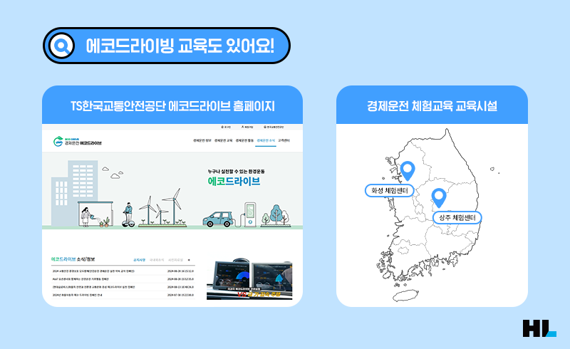 나는 얼마나 경제운전을 하고 있는지 궁금하다면 에코드라이빙 지수를 직접 측정할 수도 있습니다. TS한국교통안전공단에서는 경제운전 홍보와 실천을 위해 경제운전 체험교육을 진행하고 있는데요. 경기도 화성시와 경북 상주시에 있는 체험 센터에서 이론 교육부터 내 운전 습관 분석, 연비 절약 운전 요령과 실습까지 한 번에 할 수 있습니다.