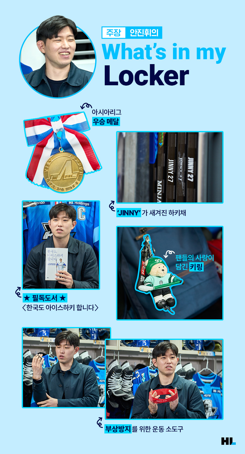 그리고 눈에 띄는 책 한권! 바로 정몽원 회장님의 <한국도 아이스하키 합니다>였는데요. 오프시즌이 되어 틈틈이 읽고 있다는 진휘 선수! 아이스하키 불모지로 불리는 한국에서 아이스하키 사랑을 실천해 온 정몽원 회장님의 이야기가 담긴 <한국도 아이스하키 합니다>, 여러분도 읽어보세요!