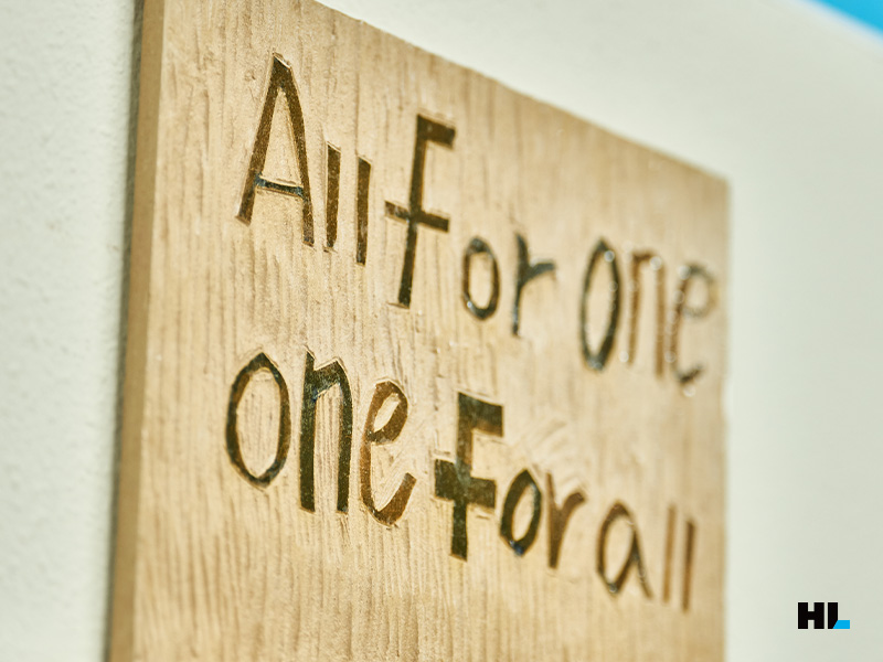이곳은 HL안양 선수단 라커룸 입구입니다. ‘All for one, one for all’이라는 문구가 새겨져 있는데요. V9을 이룰 수 있었던 HL안양의 ‘원 팀’ 정신이 엿보이죠?
