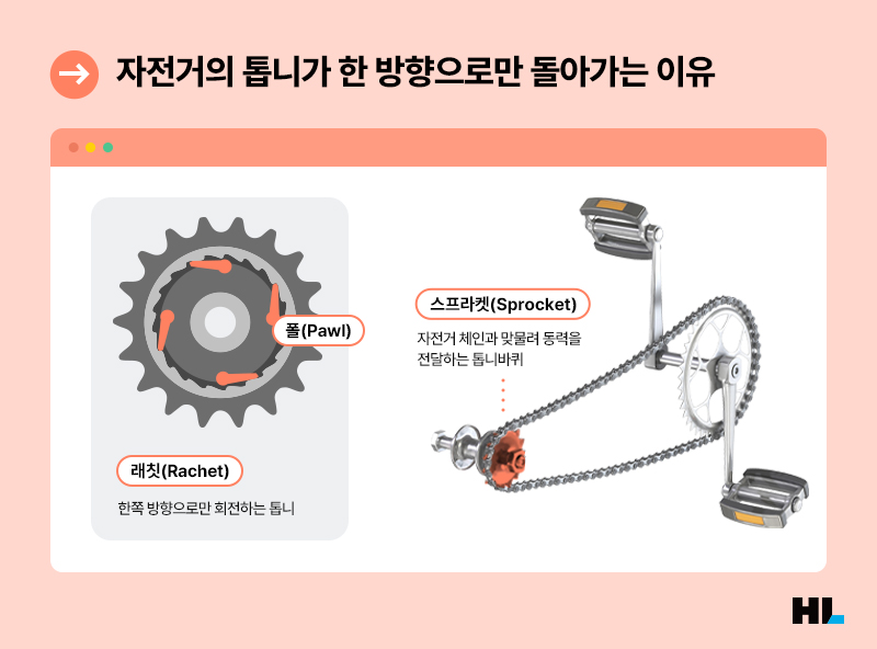 우리가 자전거 페달을 밟으면 뒷바퀴에 걸린 스프라켓(톱니바퀴)이 체인과 맞물리면서 뒷바퀴가 회전하게 되죠. 이 상태에서 뒤로 페달을 돌리면 체인도 거꾸로 감기기 때문에 바퀴의 방향이 바뀌어야 할 것 같지만 자전거는 그렇지 않습니다. 바로 래칫(Ratchet) 구조 때문인데요.