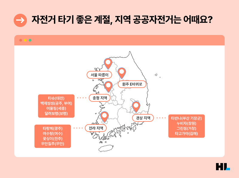 특히 전국의 지자체들은 공공자전거 서비스에 각 지역의 특색을 살린 이름을 붙여 화제를 낳기도 했는데요. 지역 방언을 활용한 ‘타슈’, ‘타랑께’, ‘타반나’부터 지역 이름을 활용한 ‘무안질주’, ‘타고가야’, ‘달려보령’까지 귀여운 이름으로 많은 시민들의 호응을 얻고 있습니다.