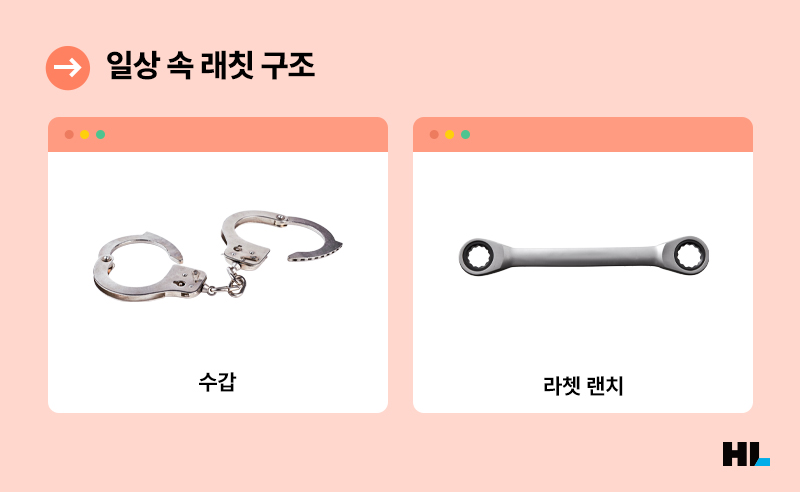 래칫의 원리는 자전거 외의 일상생활에서도 찾아볼 수 있는데요. 한 방향으로 죄어드는 수갑, 케이블타이, 라쳇 렌치처럼 한 방향으로만 움직이는 것들을 떠올려보면 쉽습니다. 또한 로봇 장난감과 같이 관절의 움직임이 있는 장난감에도 래칫 구조가 많이 탑재됩니다.
