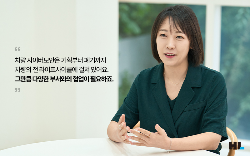 지현 : 그럼요! 차량 사이버보안은 기획 단계부터 개발, 생산, 운영, 폐기에 이르기까지 차량의 전 라이프사이클에 걸쳐 적용되기에 개발, 구매, 품질, 양산 등 수많은 부서들과 협업하는데요. 전사에 걸쳐 사이버보안 요구사항과 이슈를 공유하고 조율해야 해서 각 부서가 어떤 일을 하는지 정확히 이해하고 있어야 해요. 공부를 많이 해야 합니다(웃음).