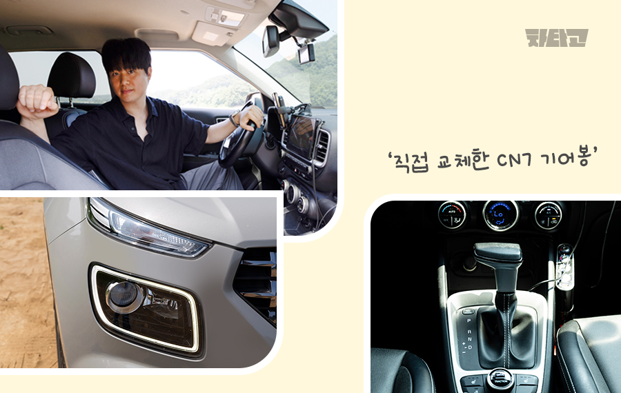 캘리퍼, 브레이크 패드, 각종 필터, 헤드램프 교체 등등 기본 정비는 직접 하는 편이죠. 더 나아가서 애프터블로우나 락폴딩 같은, 베뉴에 없는 옵션도 직접 장착하면서 관리하고 있습니다. 참고로 제 차의 기어봉은 CN7(아반떼)의 기어봉이에요. 하하.