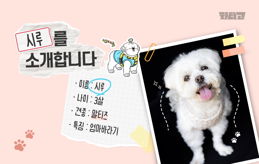 시루는 동네에서 가정 분양을 받아 만나게 되었어요. 말티즈라고 해서 분양을 받았는데, 점점 클수록 다른 견종과 섞인 것 같더라고요. 말티즈 치고는 커서요…(웃음). 근데 덕분에 더 귀엽지 않나요?