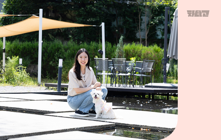 함께 한 반려견 이름은 시루이고 세 살 되었습니다. 간식으로 꾀어서 오늘 함께 나왔는데, 촬영을 위해 저보다 더 열심히 단장하고 왔어요(웃음). 호기심도 많고 겁도 많아서 어떤 분께는 착한 강아지로, 또 어떤 분께는 조금 사나운 강아지로 보일 수 있는 ‘이중견격’의 매력을 가진 친구입니다. 이번 촬영이 시루의 첫 공식(?) 나들이라 우리 가족에게도 의미가 크네요.