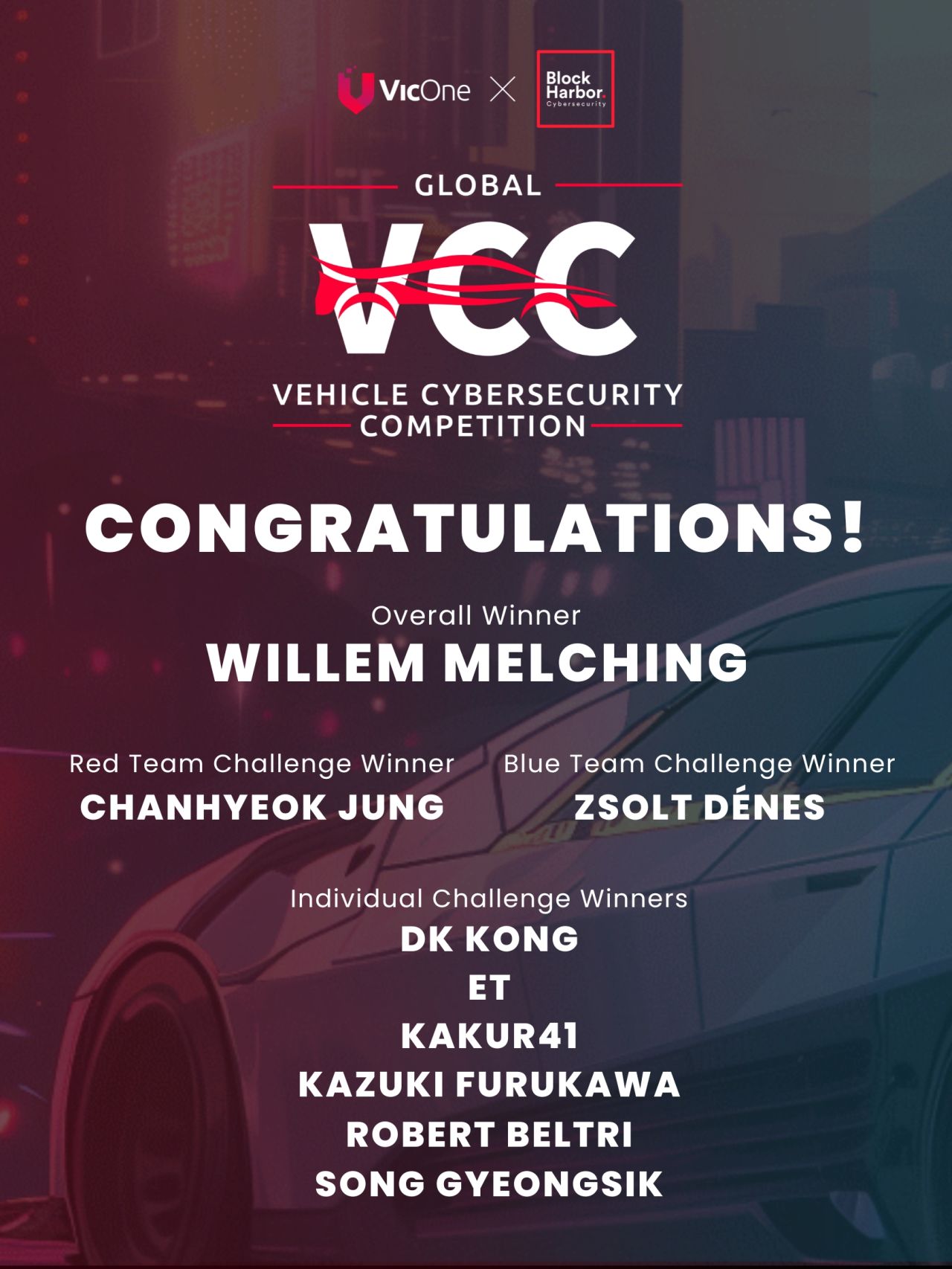 VCC(Vehicle Cybersecurity Competition)는 2023년부터 미국의 자동차 사이버보안 전문 기업인 Block Harbor와 VicOne사가 운영하는 글로벌 자동차 사이버보안 경진대회입니다. 올해는 주어진 8개의 과제를 제대로 수행했을 때 얻는 플래그 값을 웹 페이지에 인증하여 점수를 획득하는 ‘Capture The Flag(CTF)’ 방식으로 운영되었으며, 480명 이상의 참가자가 경쟁을 펼쳤습니다.
