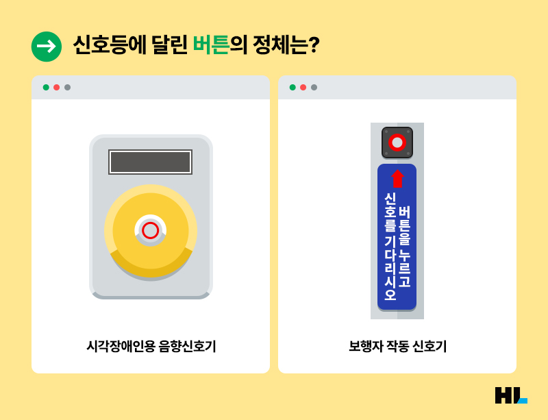 신호를 기다리다 보면 신호등에 여러 버튼이 달려있는 것을 볼 수 있는데요. 이 버튼은 무슨 역할을 할까요? 가장 많이 볼 수 있는 것은 시각장애인용 음향신호기입니다. 시각장애인들이 안전하게 횡단보도를 건널 수 있도록 소리를 통해 신호를 안내하는데요. 여기에는 방향을 알려주는 작은 단서가 숨어있다는 사실, 알고 계셨나요? “찌르르르” 귀뚜라미 소리는 남-북 방향의 횡단보도, “뻐꾹뻐꾹” 새소리는 동-서 방향의 횡단보도 점등 안내 신호입니다. 설치 지역이나 기기의 종류에 따라 소리는 다를 수 있지만, 횡단보도의 방향에 따라 다른 소리가 난다는 것은 동일한 사실!