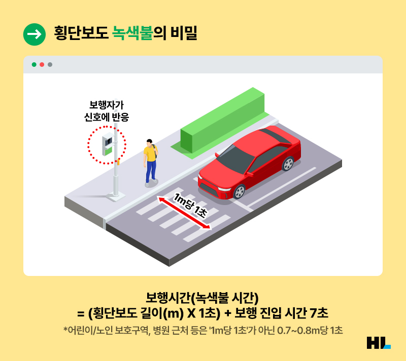 그렇다면 횡단보도의 보행 시간은 어떻게 정해지는 걸까요? 경찰청 매뉴얼에 따르면, 보행 신호 시간은 기본적으로 '1초에 1m'를 기준으로 합니다. 여기에 보행자가 신호를 보고 반응해서 발을 떼는 데 걸리는 ‘횡단보도 진입 시간’ 약 7초를 더해 총 시간을 결정합니다.
