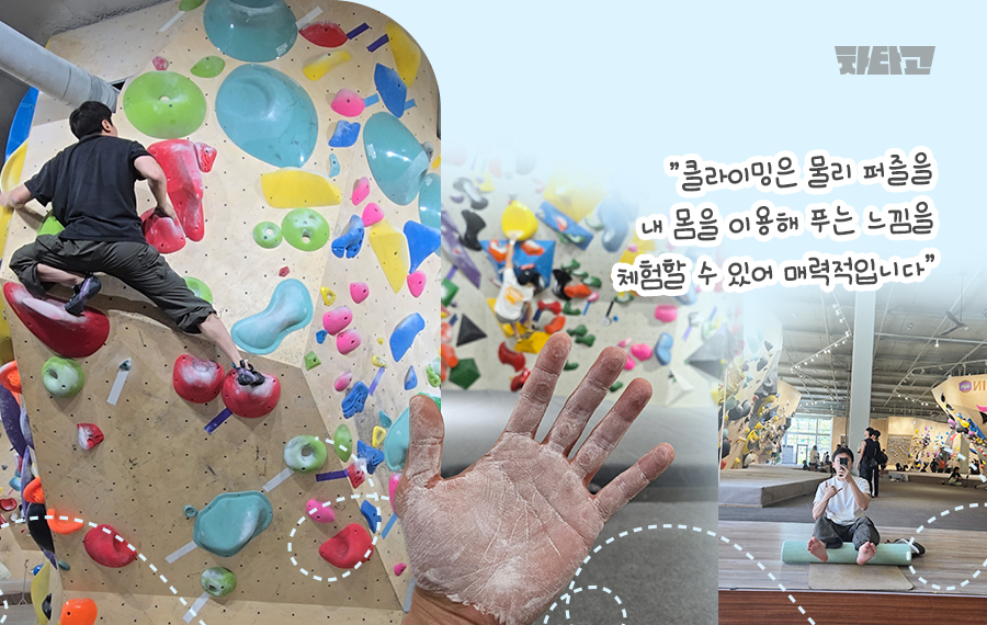 요즘은 실내 클라이밍에 푹 빠져 있습니다. 평소 주에 2~3회 정도 볼더링(실내 클라이밍)을 즐기곤 해요. 볼더링은 단순한 클라이밍을 넘어 몸과 머리를 동시에 쓰는, 마치 퍼즐을 푸는 듯한 느낌을 체험할 수 있어서 좋아합니다. 단순히 힘만 써서는 안 되거든요. 경로(루트)를 보고 어떻게 움직여야 할지, 어느 손으로 잡고, 어느 발로 디딜지 생각해야 하죠. 마치 물리 퍼즐을 내 몸을 이용해 푸는 느낌이랄까요?