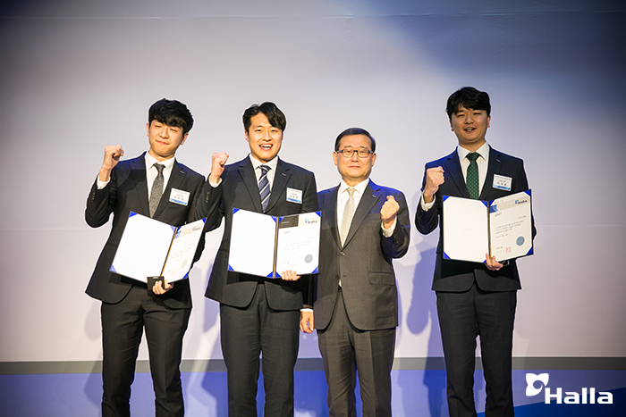 ​이어 Halla 타임즈 발표 및 교육 스케치 영상 시청, 대표 신입사원 배지 수여, 팀별 시상이 진행되었는데요. 정몽원 회장은 신입사원 대표 2명에게 배지를 수여하였고 반별 MVP 3명, 우수조 2조를 시상하며 신입사원들과 함께 시간을 나누었습니다.